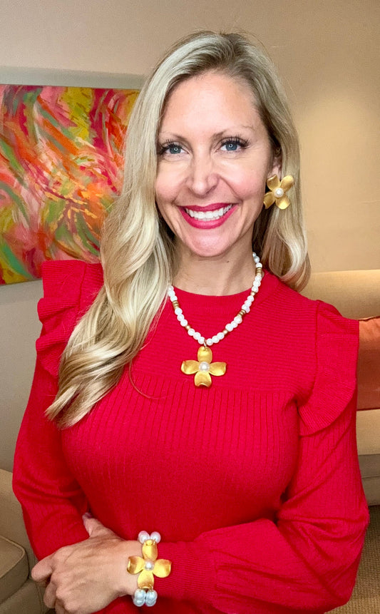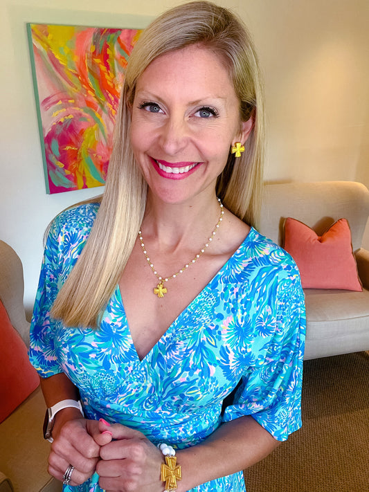 Poppy Beaded Cross & Pearl Charm Necklace in Shiny Gold
