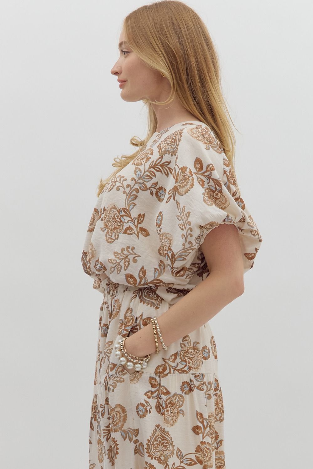 Turn heads this season in our Golden Hour Stroll Set, where effortless charm meets cozy sophistication. Featuring a waist-length dolman sleeve top with a flattering bubble hem, this floral printed beauty brings soft structure and a playful silhouette. Fully lined and woven in a lightweight, non-sheer fabric, it’s breathable yet polished. Paired with a matching tiered midi skirt, designed with an easy pull-on elastic waistband and side pockets (yes, real pockets!), this set offers comfort without compromising style. The tiered detailing adds movement, while the delicate autumn-toned florals keep things fresh, feminine, and fall-ready.
