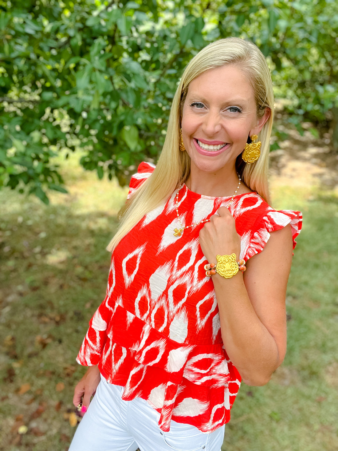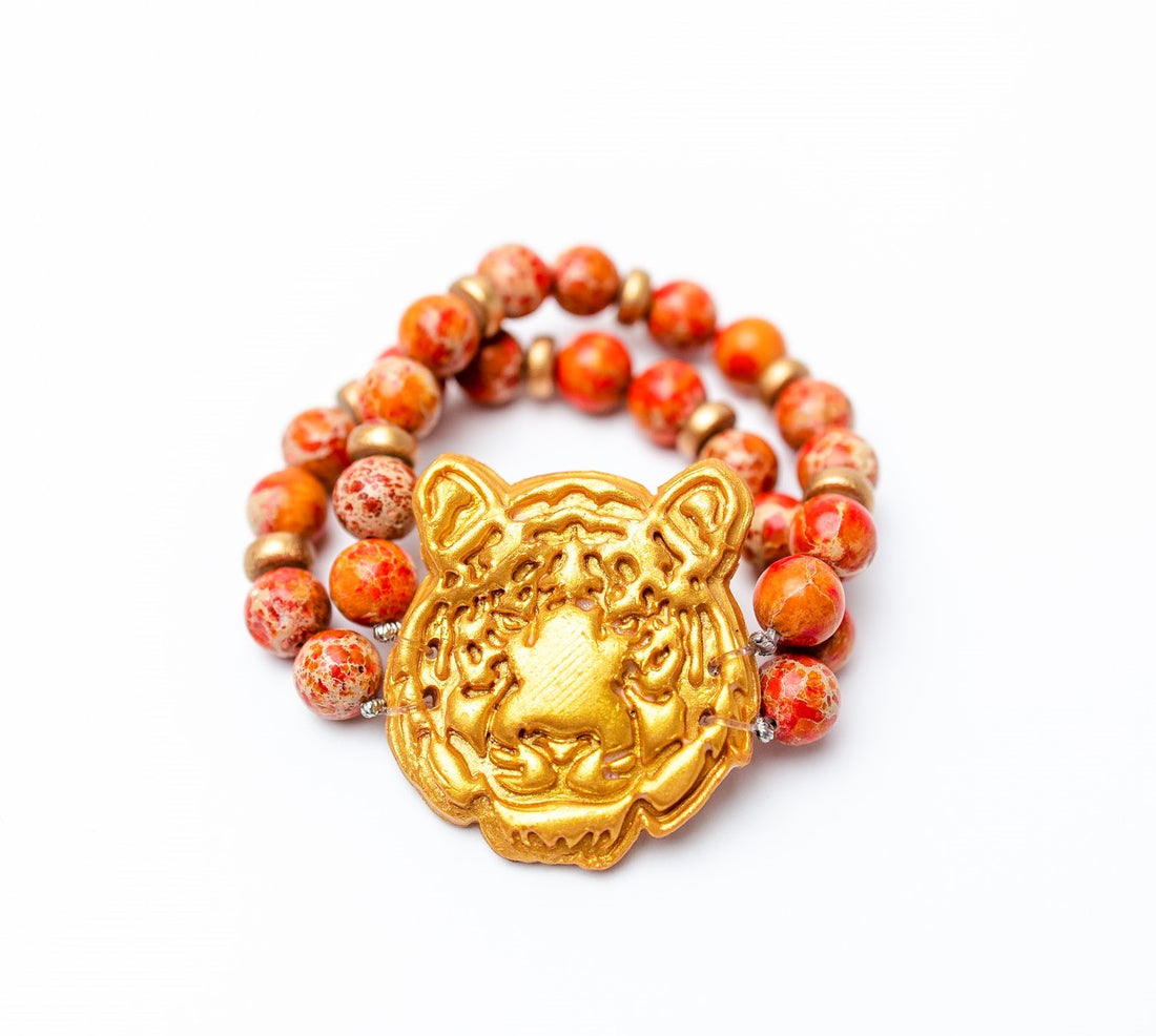 Cheer on your Tigers with the popular stacked look featuring orange jasper stones and the Tiger Face medallion!