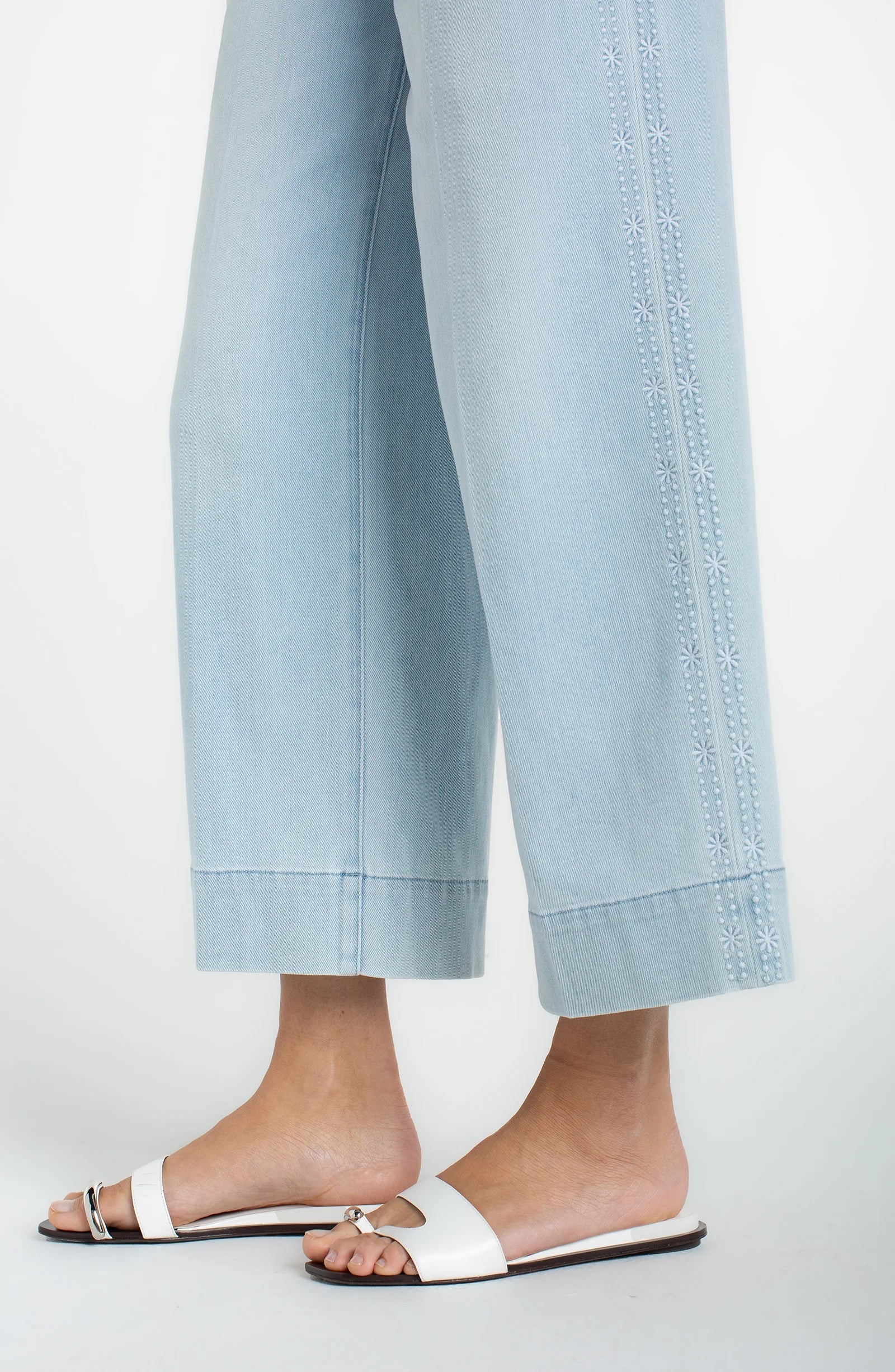 This crop wide-leg jean pairs a relaxed shape with thoughtful detail. Embroidered side seams add subtle interest to a light wash finish, while the mid rise fit keeps it comfortable and versatile.