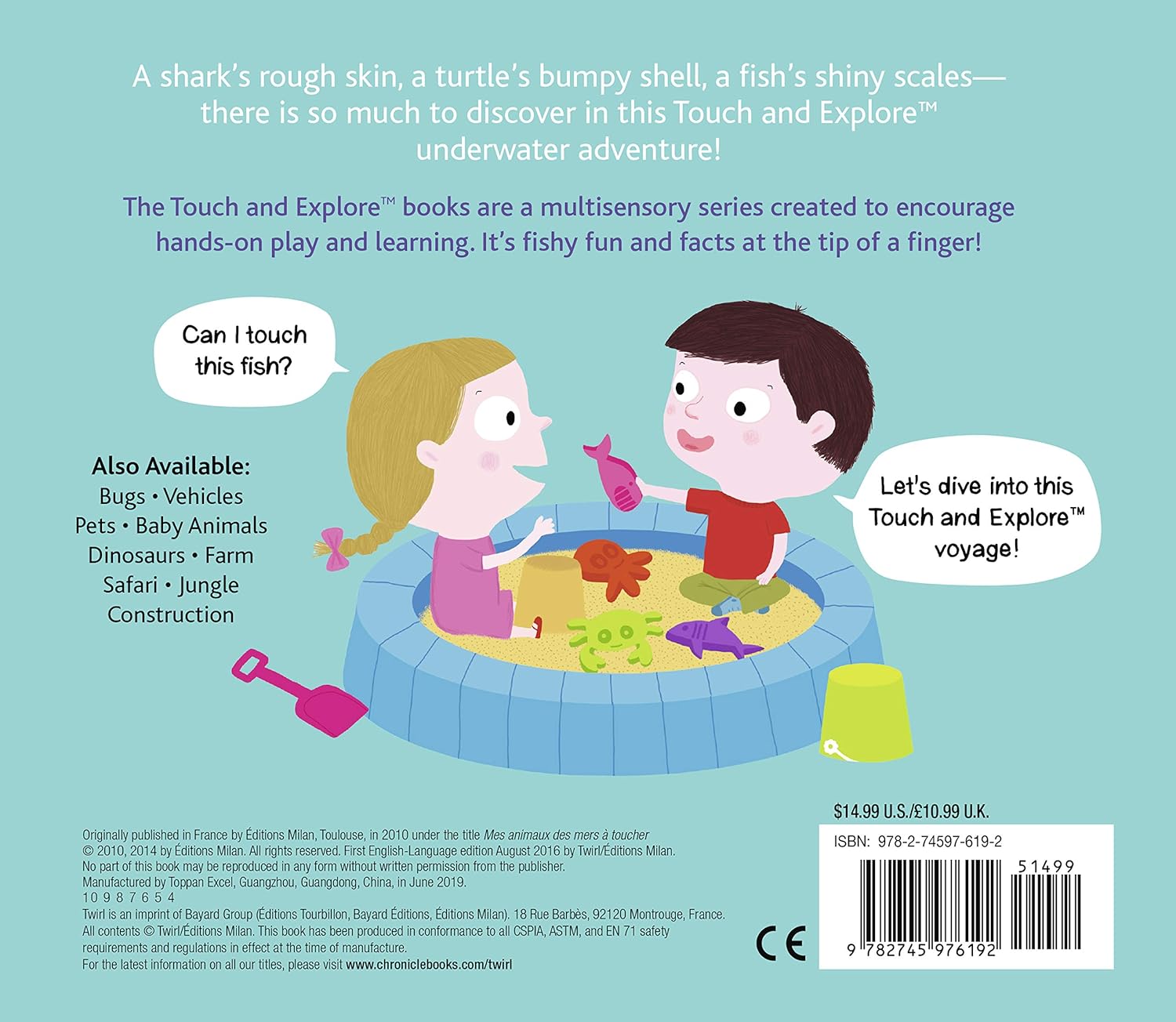 Scales, tails, flippers, and fins—let's dive into the ocean: The Touch and Explore™ series, already bestsellers in their original French editions, are well-crafted interactive titles that encourage hands-on engagement, learning and knowledge retention. As you move through each page, young readers can touch shiny scales and bumpy barnacles, turn a flap to find a clownfish hiding among an anemone, touch a shark's sandpapery skin, and discover who can squirt ink and change color! It's a trip to an underwater world that's just a touch away.